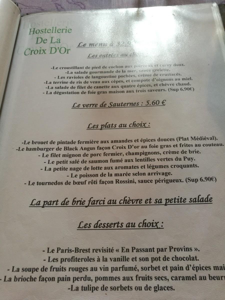 The menu also complements the restaurant’s historic ambiance with carefully crafted cocktails and a selection of champagnes, perfect for toasting special moments or unwinding in the warm, inviting atmosphere. Whether it’s a family gathering, a quiet dinner, or a tasteful celebration, the food and drinks here naturally enhance the experience, echoing the charm and elegance of its Provins location.